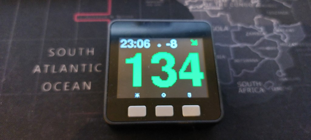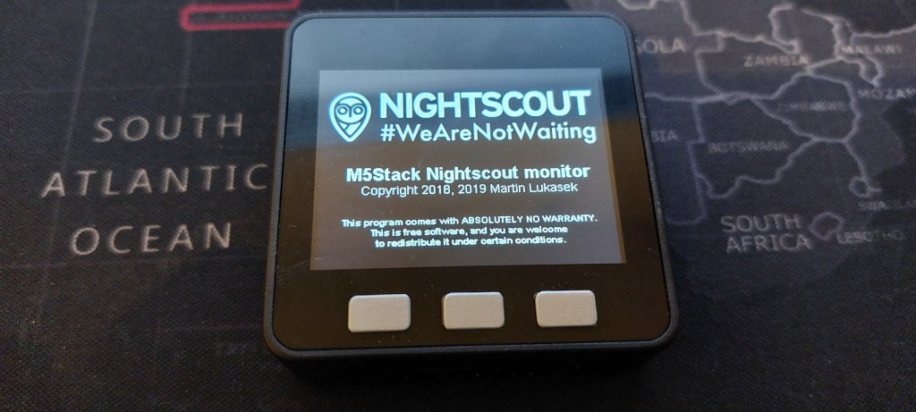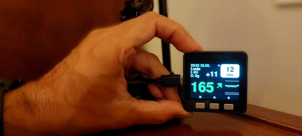 El dispositivo M5STACK es pequeño y está alimentado por un cable a través del puerto USB, no tiene el coste de un móvil y puede estar enchufado en cualquier parte de tu casa que tenga cobertura WiFi. Yo lo tengo en mi mesilla de noche para poder consultarlo a cualquier hora de la noche sin tener que ir a consultar las glucemias en el móvil.
