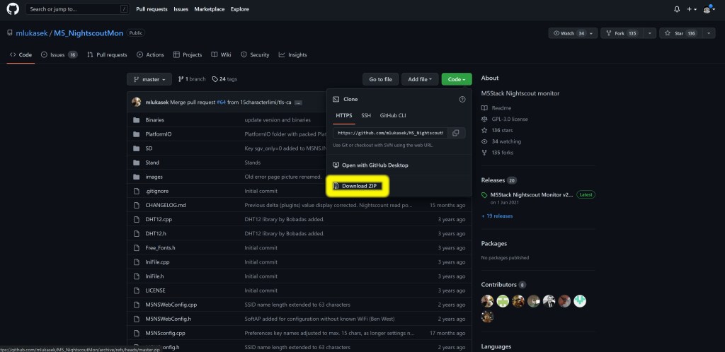 En ese momento se descargará en vuestro ordenador el código que luego transferiremos al M5STACK y que está en el fichero «M5_NightscoutMon-master.zip».