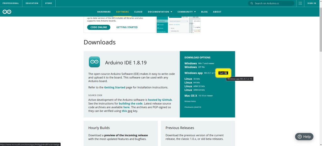 Para instalar el IDE de Arduino, visitad la web de Arduino a través de este link. En esta página tenéis que seleccionar la opción del menú de «Download Options» que indica «Windows app Win 8.1 or 10» y pinchar en el cuadrado negro que pone «Get» y el símbolo de Windows.
