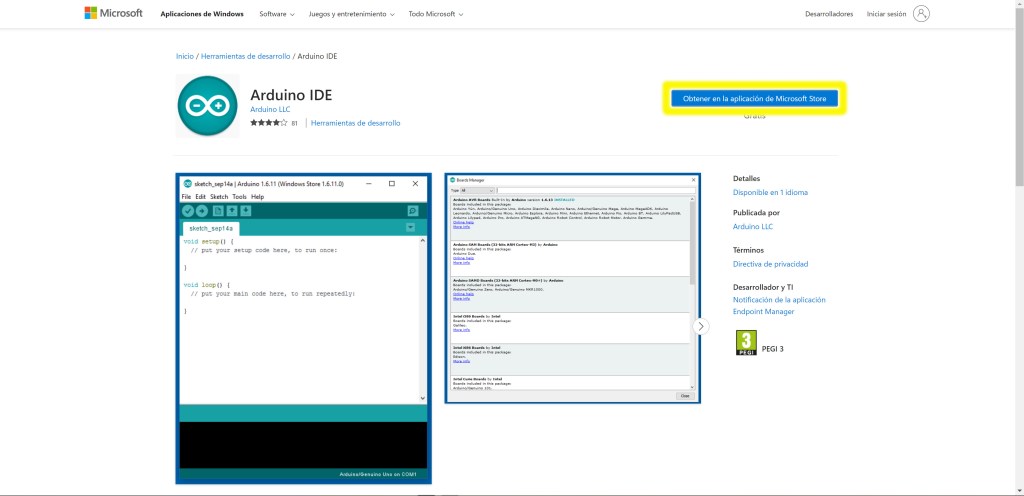 Después de esto se abrirá una pantalla por si queréis hacer una donación a los desarrolladores del IDE de Arduino y a continuación os saldrá la pantalla para instalarlo. Pinchad en el botón «Obtener en la aplicación Microsoft Store» y se abrirá el Store de Microsoft para que podáis instalar el Arduino IDE. Seguid todos los pasos hasta que lo hayáis terminado de instalar.