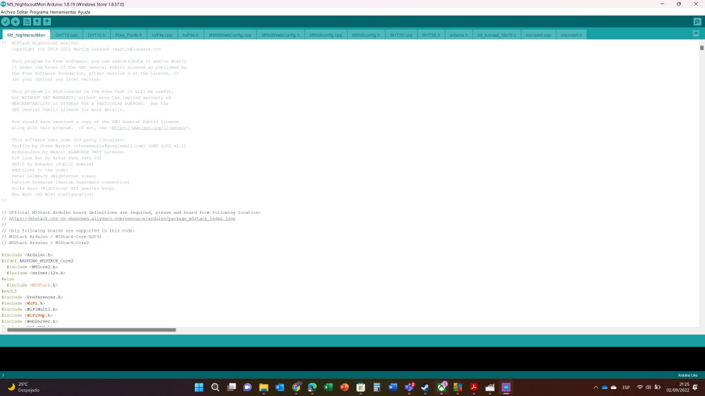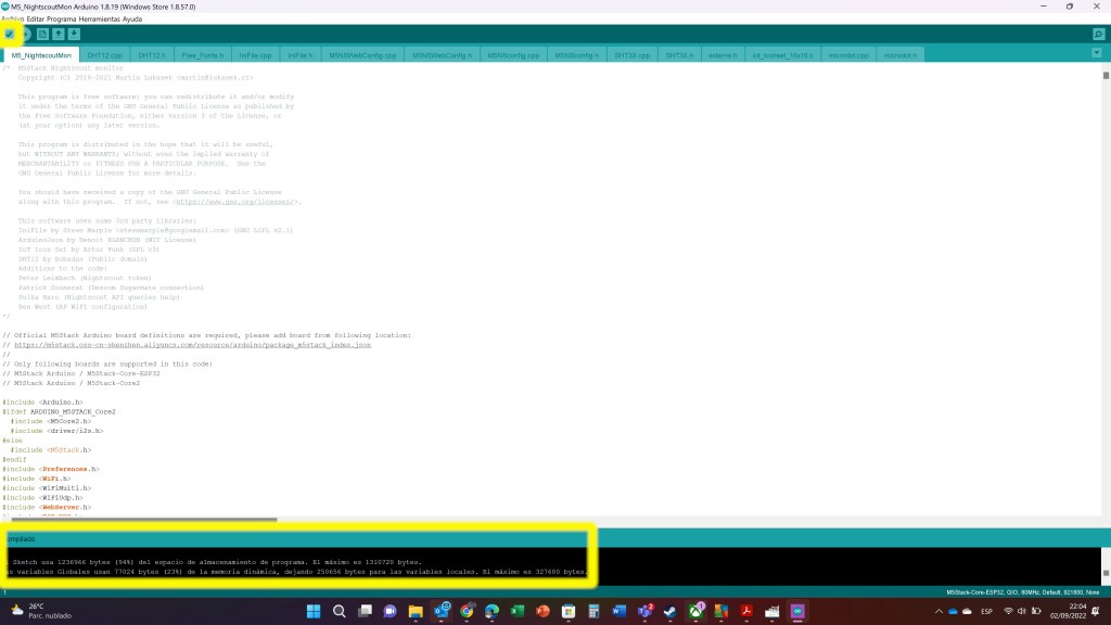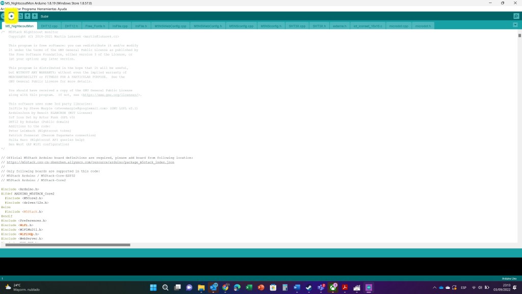 Para ello buscamos el fichero descargado «M5_NightscoutMon-master.zip», lo descomprimimos y desde el IDE de Arduino abrimos el fichero «M5_NightscoutMon.ino».