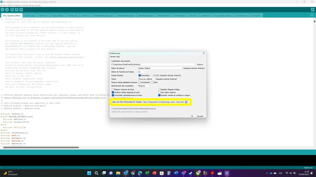 A continuación, vamos a instalar la placa M5STACK en el IDE de Arduino, para que pueda reconocerla. Para ello tenemos que ir al Menú de Archivo y seleccionar «Preferencias». Cuando se abra la ventana de Preferencias, en el apartado de «Gestor de URLs Adicionales de Tarjetas» incorporad este texto: «https://dl.espressif.com/dl/package_esp32_index.json» y dadle a «OK».