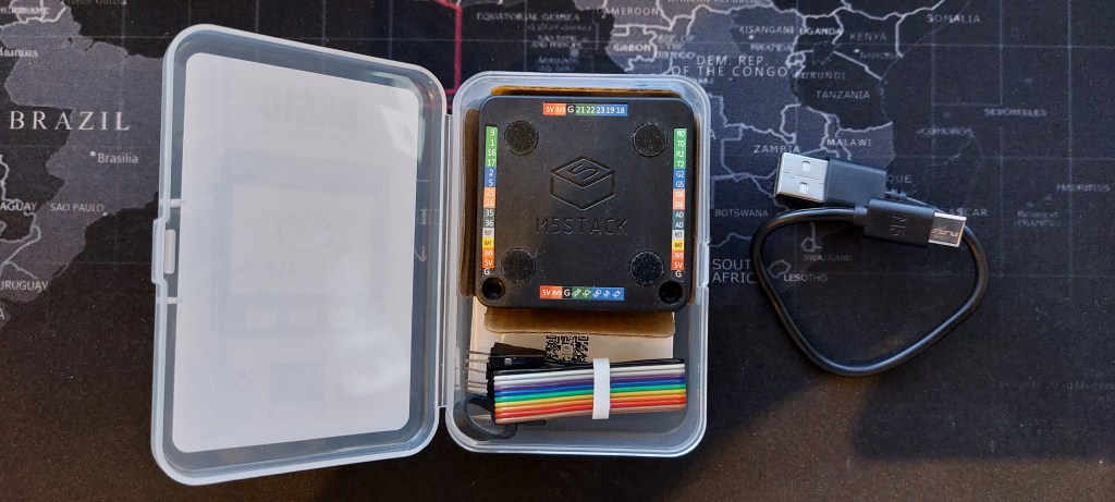 Veréis que en la caja de plástico blanca tenéis el M5STACK, que es una caja negra con una pantalla, un cable USB-C a USB normal para conectarlo al ordenador y unos cables de colores (que no vamos a usar en este artículo, pero que para los #makers que lean este artículo podrán servir para conectar posteriormente al M5STACK tiras de Led u otros «cacharrillos»).