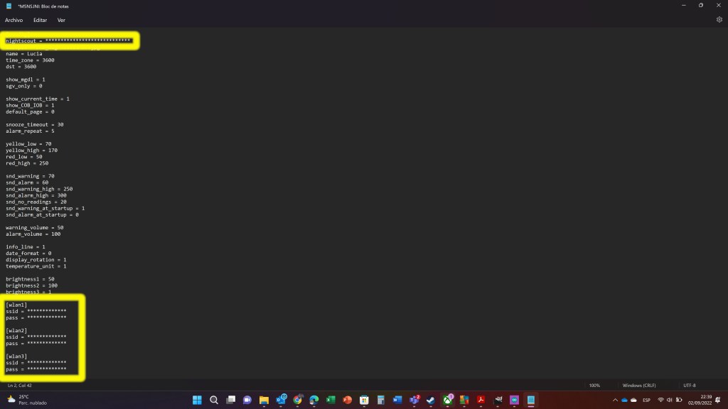 Para eso en la tarjeta MicroSD abrimos el fichero «M5NS» donde podréis ver todos los valores de configuración que tendrá nuestro M5STACK.